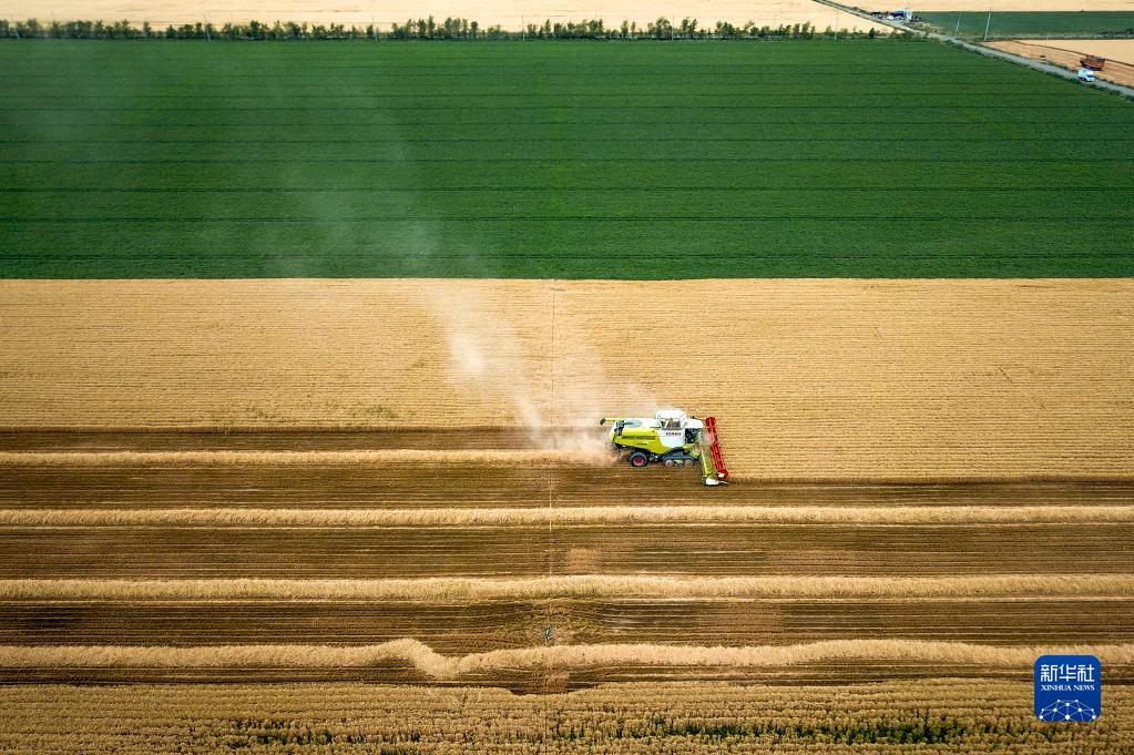 聯(lián)合收割機在新疆昌吉回族自治州奇臺縣大泉塔塔爾民族鄉(xiāng)的麥田里收割小麥(2022年7月7日攝,無人機照片)。新華社記者 張嘯誠 攝