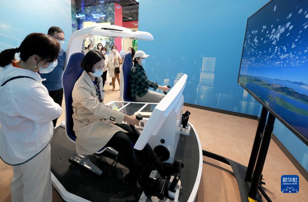 10月7日,觀眾在“奮進(jìn)新時代”主題成就展上體驗操縱直升機(jī)訓(xùn)練模擬器。當(dāng)日是國慶長假的最后一天,大批觀眾來到北京展覽館參觀“奮進(jìn)新時代”主題成就展。新華社記者 王毓國 攝