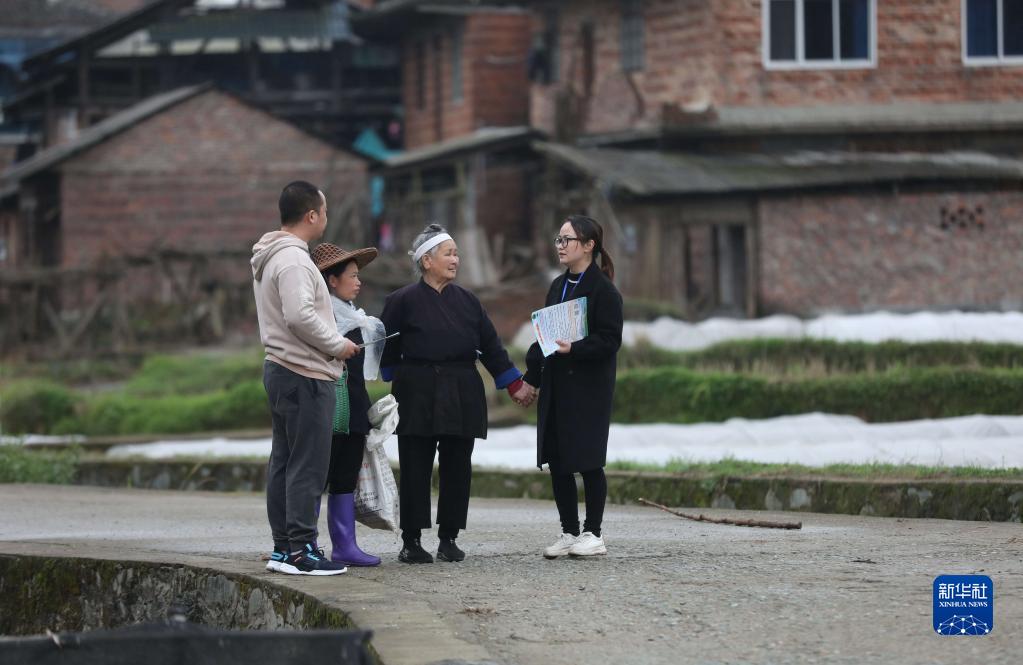 在廣西柳州市三江侗族自治縣良口鄉(xiāng)南寨村,紀(jì)檢監(jiān)察干部(右一、左一)在了解惠農(nóng)政策落實(shí)情況(2022年3月24日攝)。新華社記者 黃孝邦 攝
