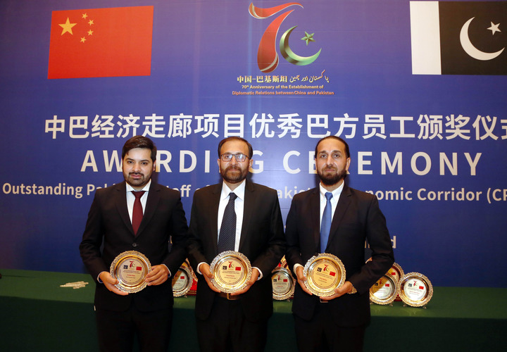 2021年12月29日,優(yōu)秀員工代表在巴基斯坦伊斯蘭堡舉行的中巴經濟走廊項目優(yōu)秀巴基斯坦員工頒獎儀式上合影。