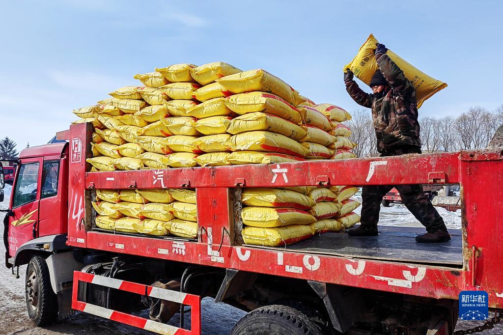 北大荒集團五大連池農場科技服務中心工人在裝運肥料(2月16日攝)。新華社發(fā)(陸文祥 攝)