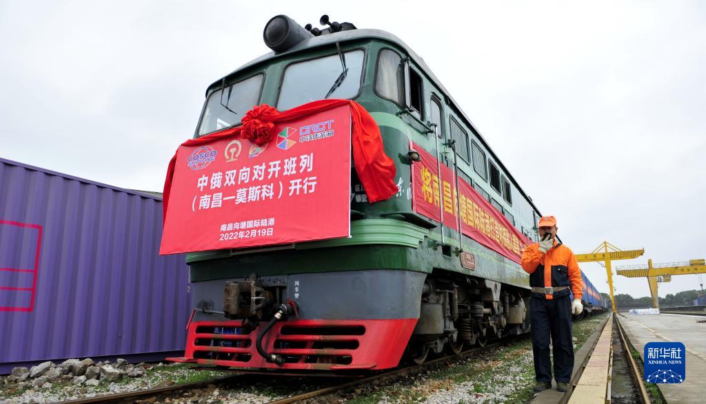2022年江西首列中俄雙向對開班列(南昌—莫斯科)在南昌向塘國際陸港準備出發(fā)(2022年2月19日攝)。新華社記者 彭昭之 攝