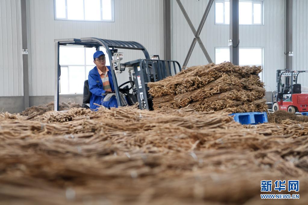 在甘肅省隴南市宕昌縣哈達鋪琦昆現代中藥材倉儲物流基地,工作人員使用叉車搬運中藥材(2020年9月18日攝)。新華社記者 范培珅 攝