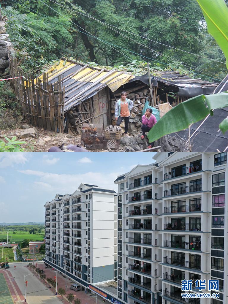 這是一張拼版照片,上圖為:2018年11月11日在廣西田東縣思林鎮(zhèn)龍邦村拍攝的村民和自家簡陋的房屋(思林鎮(zhèn)政府供圖);下圖為:2019年8月28日拍攝的當地為龍邦村新建的位于田東縣思林鎮(zhèn)的易地扶貧搬遷安置點(無人機照片,新華社記者曹祎銘攝)。新華社發(fā)