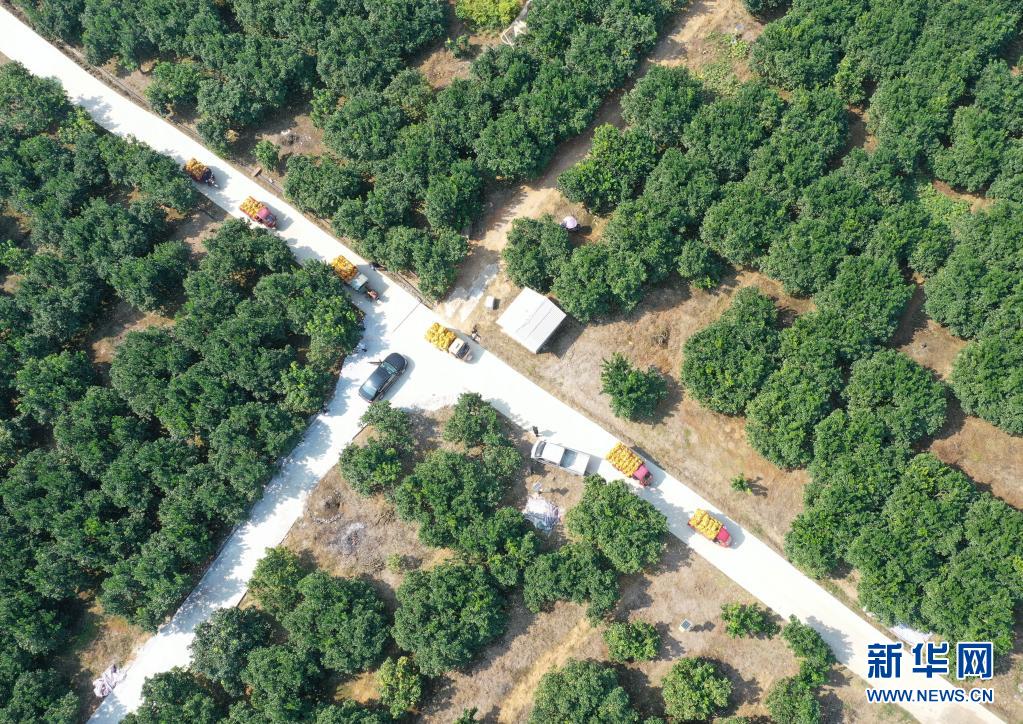在廣西羅城仫佬族自治縣金玉柚生態(tài)產業(yè)扶貧示范區(qū),裝載柚子的車輛在柚子園內行駛(2019年11月5日攝,無人機照片)。新華社記者 陸波岸 攝