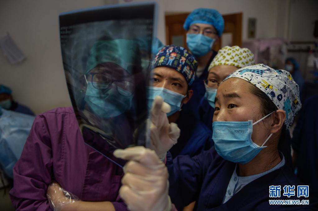 在西藏拉薩市人民醫(yī)院內,首都兒科研究所的援藏醫(yī)生韓同英(右一)進行教學查房時,與當地醫(yī)生們一起研究入院新生兒胸片(2020年8月3日攝)。新華社記者 彭子洋 攝