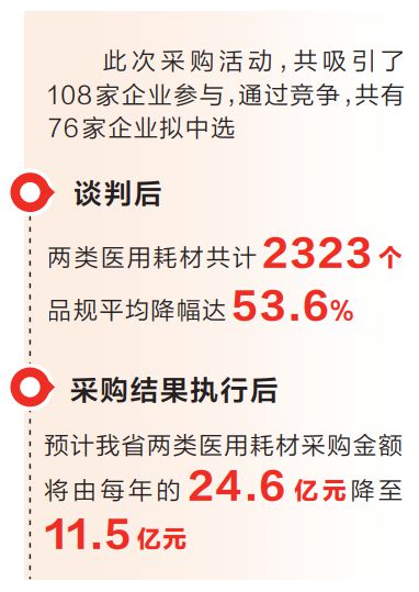 此次采購(gòu)活動(dòng),共吸引了108家企業(yè)參與,其中,國(guó)內(nèi)企業(yè)70家、外資企業(yè)38家。通過前期充分調(diào)研,會(huì)中集中開標(biāo)、兩輪談判等公平競(jìng)爭(zhēng)環(huán)節(jié),共有76家企業(yè)擬中選。談判后,兩類醫(yī)用耗材共計(jì)2323個(gè)品規(guī)平均降幅達(dá)53.6%。采購(gòu)結(jié)果執(zhí)行后,預(yù)計(jì)我省兩類醫(yī)用耗材采購(gòu)金額將由每年的24.6億元降至11.5億元。