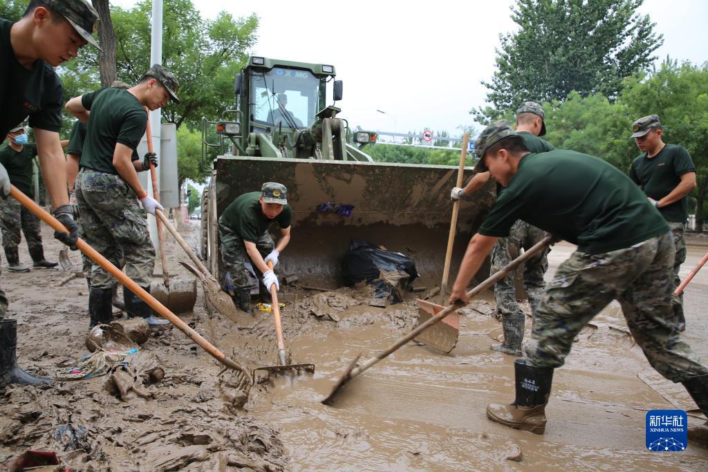 8月7日,武警河北總隊(duì)機(jī)動(dòng)支隊(duì)官兵在涿州朝陽大街搬運(yùn)垃圾、清淤清泥、沖洗街道。新華社發(fā) (趙佳亮 攝)