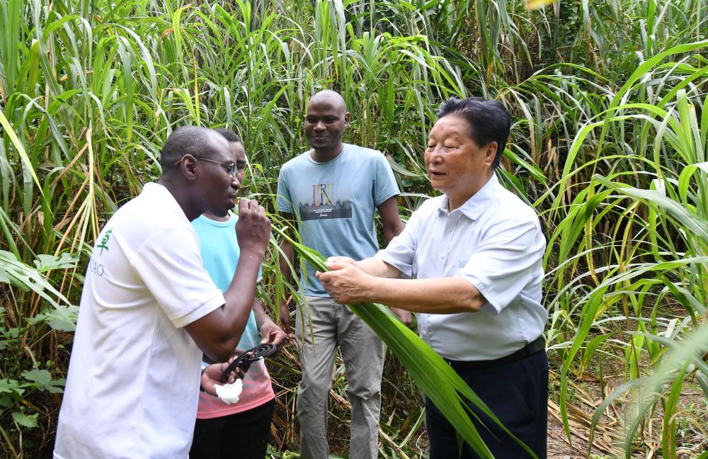 福建農(nóng)林大學國家菌草工程技術研究中心首席科學家林占熺(右一)在福建農(nóng)林大學菌草園讓尼日利亞留學生試嘗幼嫩菌草的味道(2021年8月12日攝)。新華社記者 林善傳 攝
