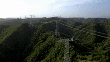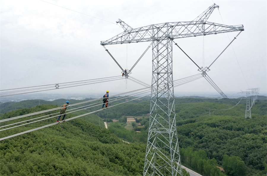 ??國網(wǎng)河南省電力公司員工在±800千伏青豫特高壓工程西陜段進(jìn)行線路檢修。