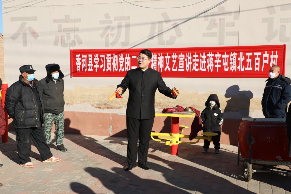 ??河北省香河縣文化館的文藝工作者張鑫銘在香河縣蔣辛屯鎮(zhèn)北五百戶村進行黨的二十大精神“快板宣講”(2022年12月13日攝)。新華社發(fā)