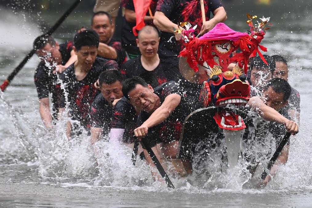 ??2023年6月22日,農(nóng)歷五月初五,中國傳統(tǒng)節(jié)日端午節(jié),村民在杭州西溪國家濕地公園的蔣村龍舟勝會上劃龍舟。蔣村龍舟勝會于2011年被列入國家級非物質(zhì)文化遺產(chǎn)名錄。新華社記者 黃宗治 攝