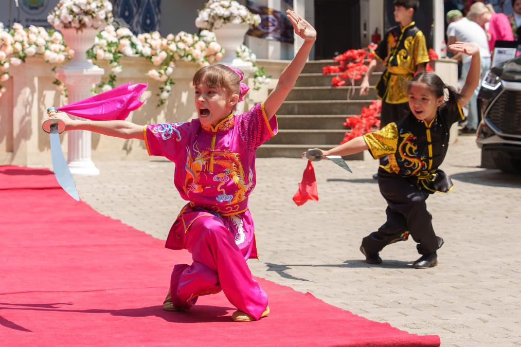 2023年5月27日,小演員在烏茲別克斯坦首都塔什干的中央公園表演武術。