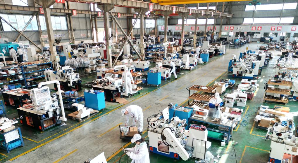 ??2月20日,工人在貴州省黔東南苗族侗族自治州丹寨縣金鐘經(jīng)濟(jì)開發(fā)區(qū)一家生產(chǎn)機(jī)床的企業(yè)車間忙碌(無人機(jī)照片)。新華社發(fā)(余天英 攝)