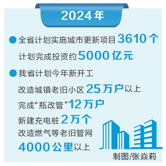 聚焦群眾“急難愁盼”等突出問題,我省堅持項目為王,科學謀劃實施城市更新項目。針對“一主兩副”重點城市和城市生命線安全工程、老舊小區(qū)改造、地下管網改造等重點領域,完善城市更新項目庫,強化項目監(jiān)測調度,穩(wěn)步推動項目落地見效。我省計劃今年新開工改造城鎮(zhèn)老舊小區(qū)25萬戶以上、完成“瓶改管”12萬戶、新建充電樁2萬個,改造燃氣等老舊管網4000公里以上。
