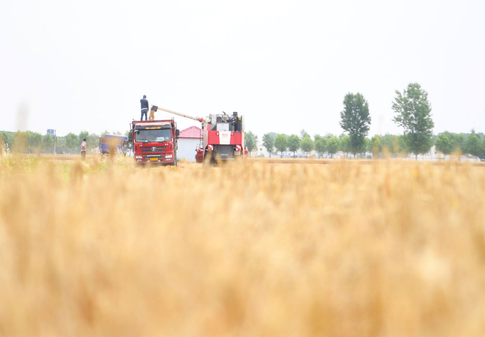 ??2024年5月28日,在河南省鄧州市文渠鎮(zhèn)的一處麥田里,村民將收獲的小麥裝車。新華社記者 郝源 攝