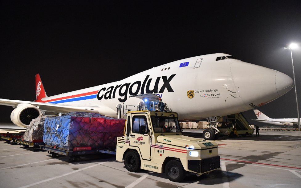 ??在鄭州新鄭國(guó)際機(jī)場(chǎng),工作人員駕駛新能源拖車為一架盧森堡貨航貨機(jī)卸貨(2023年8月1日攝)。新華社記者 李嘉南 攝