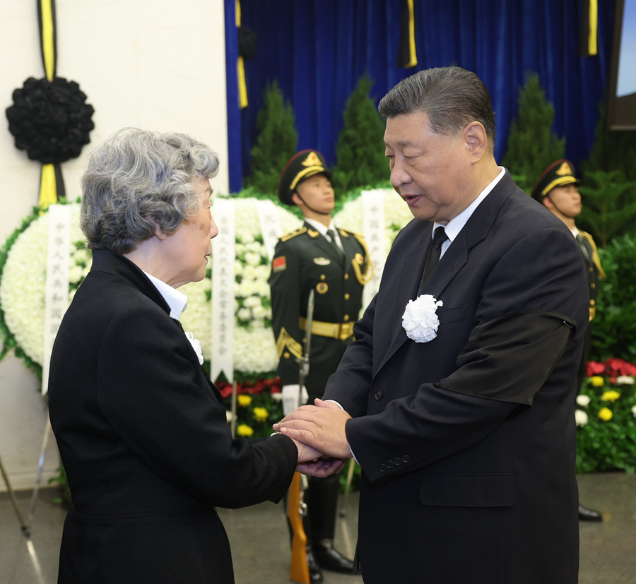 ??10月14日,吳邦國同志遺體在北京八寶山革命公墓火化。習(xí)近平、趙樂際、王滬寧、蔡奇、丁薛祥、李希、韓正等前往八寶山送別,胡錦濤送花圈表示哀悼。這是習(xí)近平與吳邦國親屬握手,表示深切慰問。新華社記者 鞠鵬 攝
