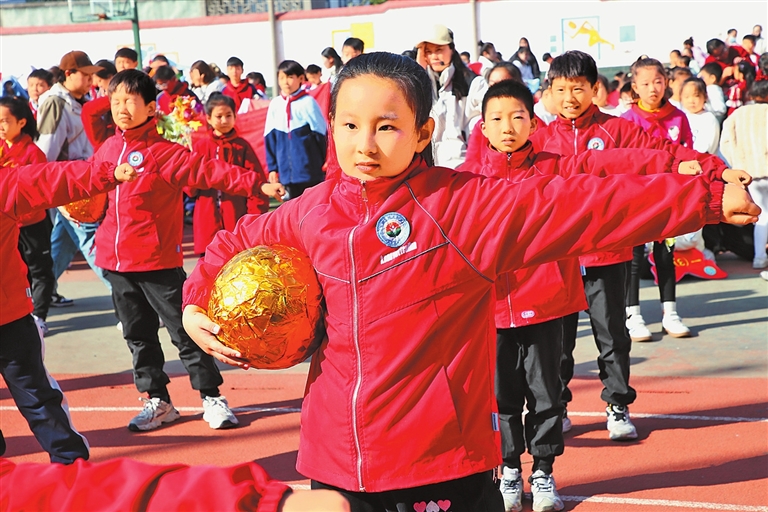 10月24日,焦作市解放區(qū)幸福街小學(xué)學(xué)生正伴隨著音樂跳自編的韻律操。自秋季新學(xué)期開學(xué)以來,該區(qū)開展形式多樣、內(nèi)容豐富的特色體育教學(xué)活動,自編自創(chuàng)體育活動項(xiàng)目,讓學(xué)生們通過別樣的體育活動強(qiáng)健體魄。李良貴 攝