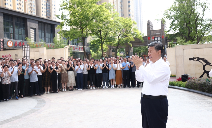 ??2022年6月28日,習(xí)近平總書(shū)記在東湖高新區(qū)左嶺街道智苑社區(qū)廣場(chǎng)同干部群眾親切交流。新華社記者 鞠鵬 攝