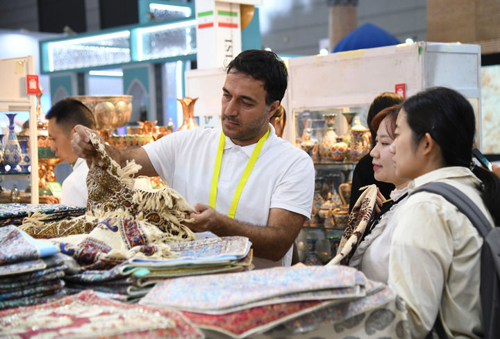 ??2024年9月20日,在陜西省西安市舉行的第八屆絲綢之路國(guó)際博覽會(huì)上,來自伊朗的參展商(前左一)向觀眾介紹產(chǎn)品。 新華社記者 張博文 攝