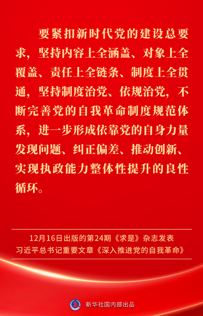 ? ?12月16日出版的第24期《求是》雜志發(fā)表習近平總書記重要文章《深入推進黨的自我革命》。我們黨為什么要自我革命、為什么能自我革命、怎樣推進自我革命?習近平總書記這樣闡述——